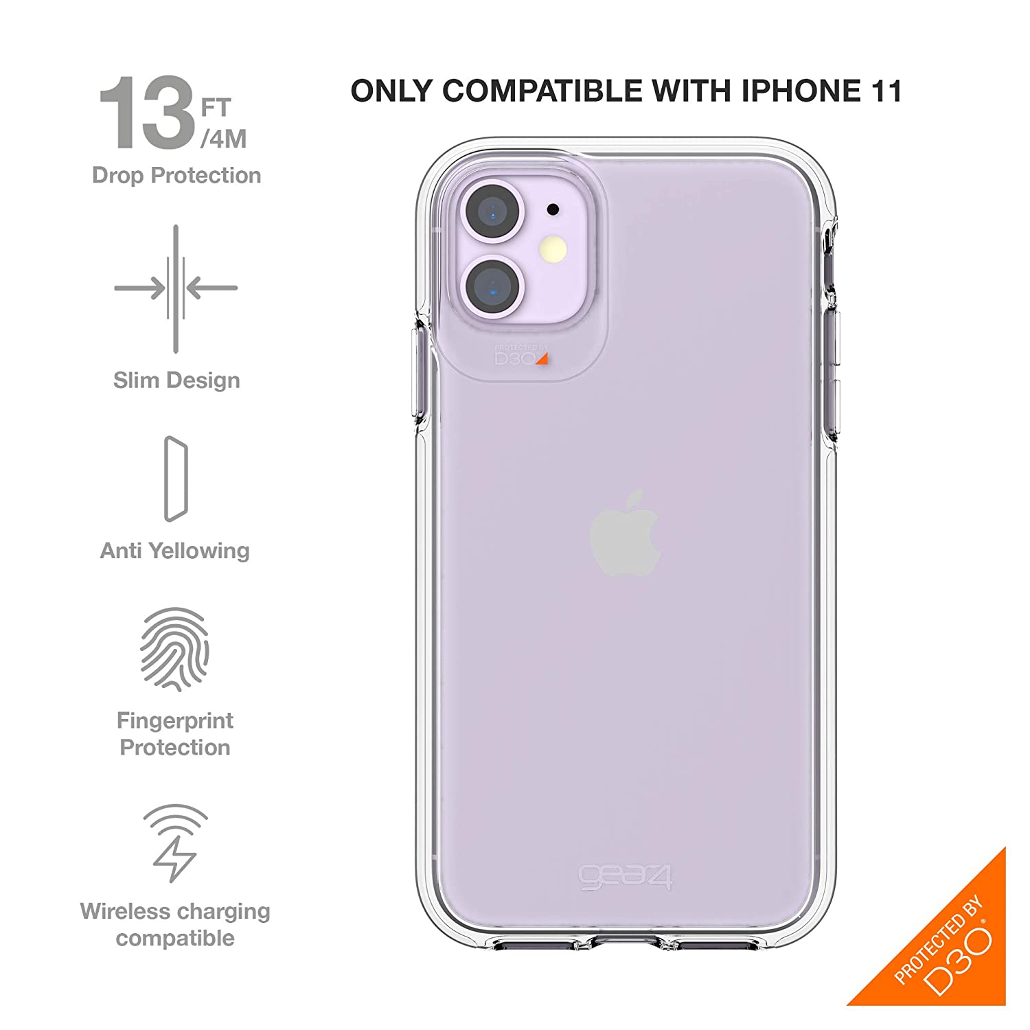 The GEAR4 Crystal Palace case offers clear protection for the iPhone 11. It features impact-resistant materials for drop protection while maintaining a slim profile. The clear design allows the phone’s original color to show through, combining style with functionality.